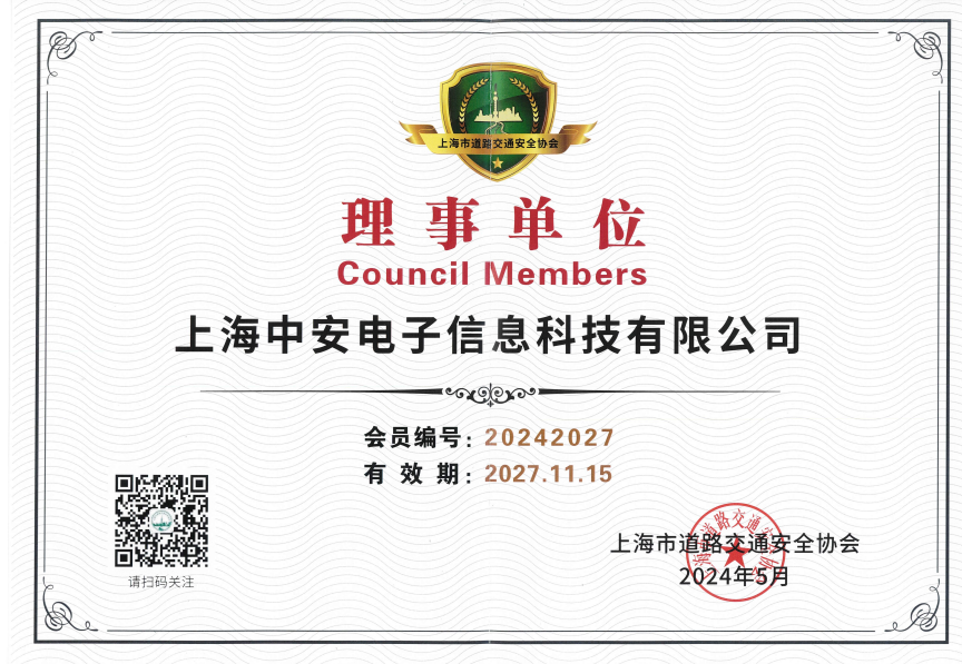 中安科技榮膺上海市道路交通安全協(xié)會(huì)理事單位稱(chēng)號(hào)(2024-07-28)